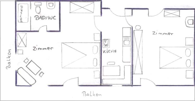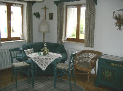 Kleinere Ferienwohnung mit 50 m2 für 2 - 4 Personen, zweiWohnschlafzimmer, komplett eingerichtete Wohnküche, Dusche, WC, TV mit Satelitenanschluss und Balkon mit Bergblick.